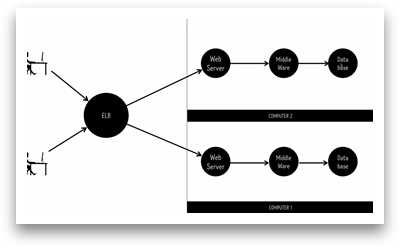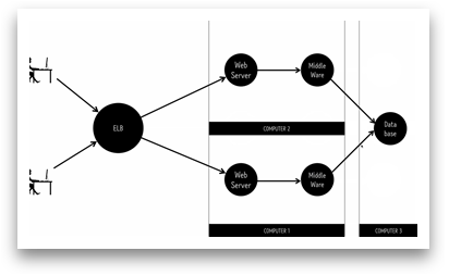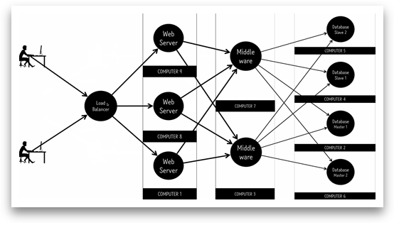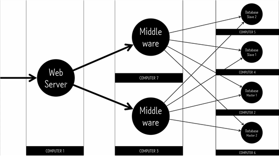 DB와 middle ware를 여러 컴퓨터를 통해 확장하여 처리하는 것이다.