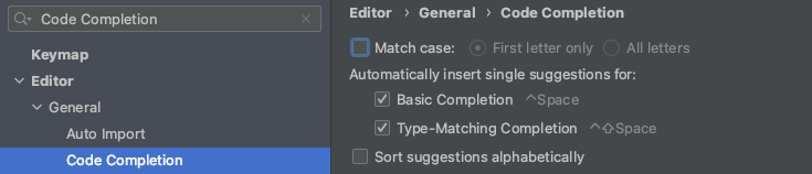 Editor / General / Code Completion 대소문자 상관 없이 자동완성을 위해서 Match case를 체크 해제할 것