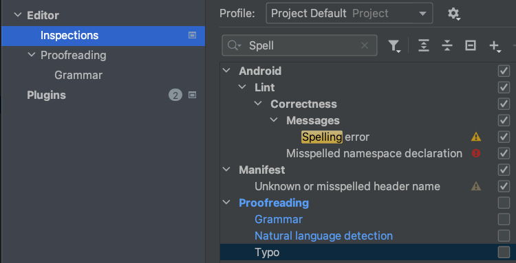 Editor / Inspections에서 Proofreading 부분에서 맞춤법 비활성화 (거슬림)