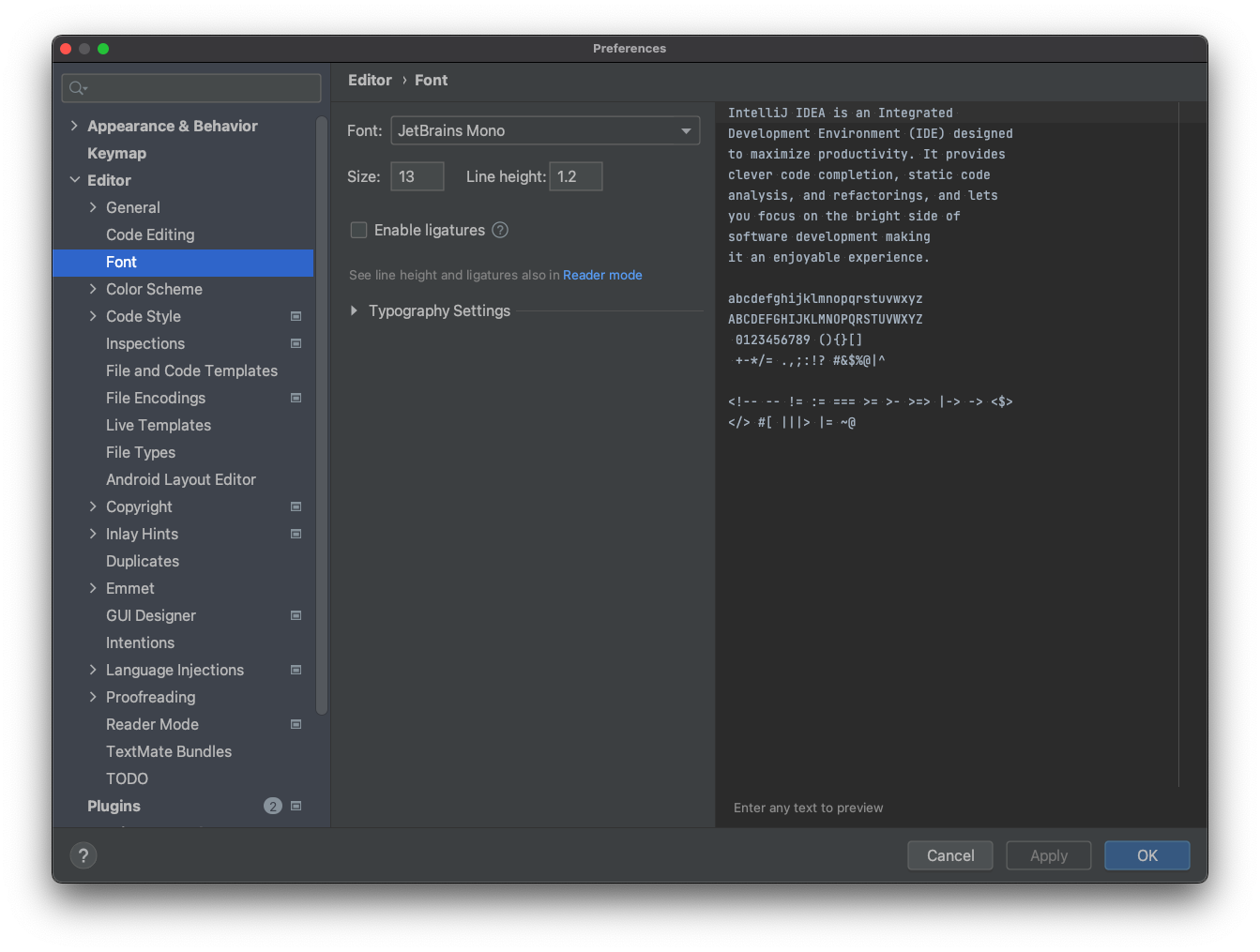 cmd + ,로 perfenrence 진입 가능