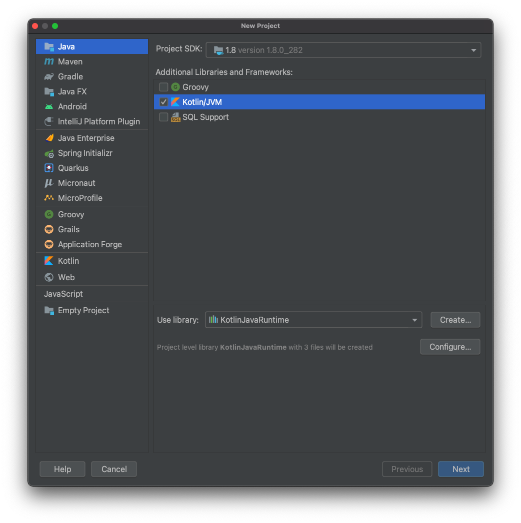 Kotlin 프로젝트를 기준으로, Kotlin을 설정한 후, Project이름을 정하고, 원하는 템플릿을 설정합니다.