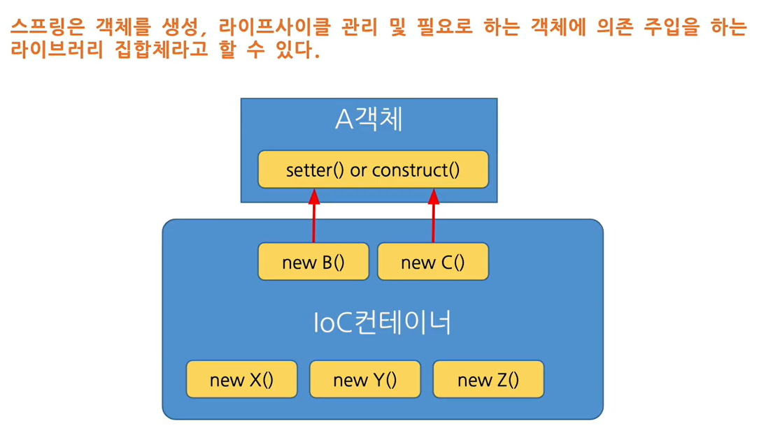 - 주입 : 어떤 함수, 클래스 등이 내부에 사용하는 다른 함수, 클래스를 내부에서 생성하는 것이 아니라 외부에서 생성하여 넣어주는 것을 '주입'이라 함