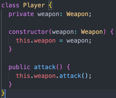 여기서 우리는, Weapon이 아니라, 의존성을 사용하게 되는 Player 쪽에서 결정하게 되는, 관계가 역전된 모습을 확인해볼 수 있습니다.