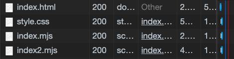 개발자 도구에서 Network 창을 열어서 확인해보면, index.mjs, index2.mjs와 같이 2개의 js가 로드된 것을 확인할 수 있습니다.