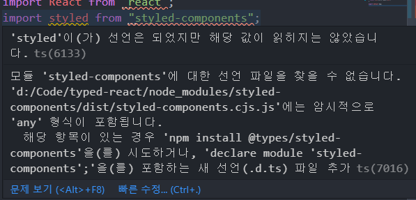 타입을 매기지 않은 패키지를 그냥 사용하려고 하면 다음과 같이 오류가 난다.