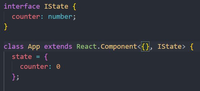 컴포넌트 후에 <> 내부에 state의 타입을 정의한 interface를 적어주면 된다. props가 없다면 다음과 같이 빈 객체를 주면 된다. <{}, IState>