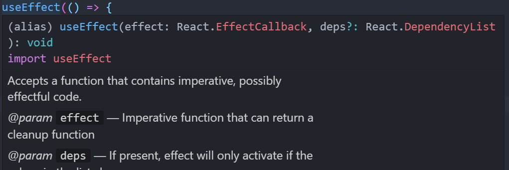 useEffect는 2개의 인자를 받는다. 하나는 작동할 함수, 다른 하나는 dependencies이다. 설명에 따르면 deps가 있다면, effect will only activate if the values in the list change. 라고 한다.