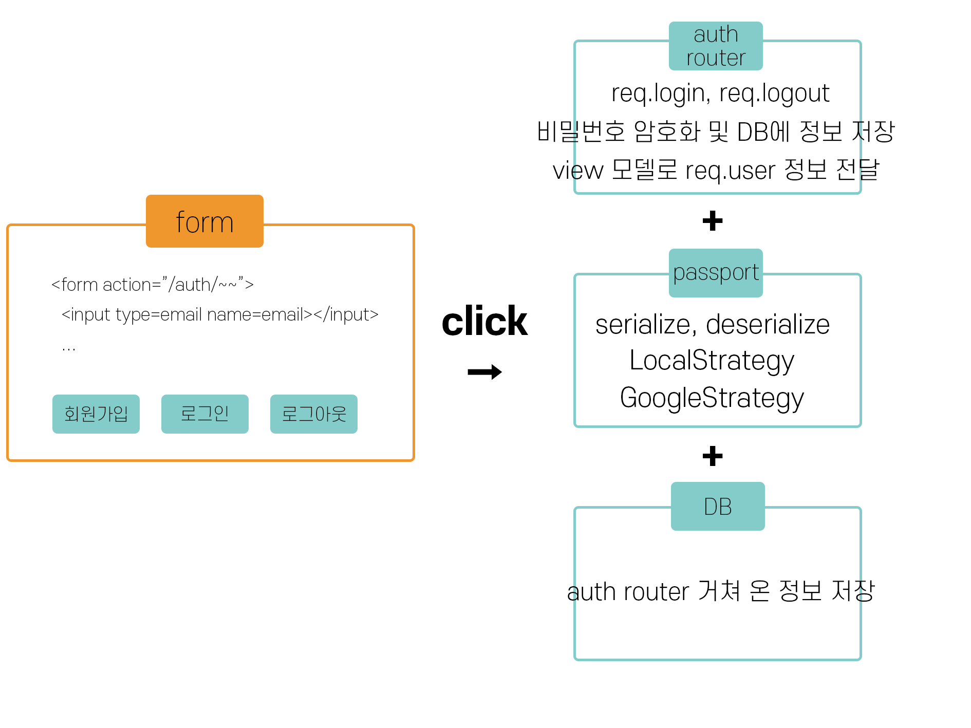 * passport를 import함으로써 req.user(로그인이 된 유저의 도큐먼트), req.login, req.logout, req.isAuthenticated(로그인 여부를 boolean값으로 알려줌)이 활성화됩니다. req.session은 serialize, req.user는 deserialize의 결과로 생성됩니다.