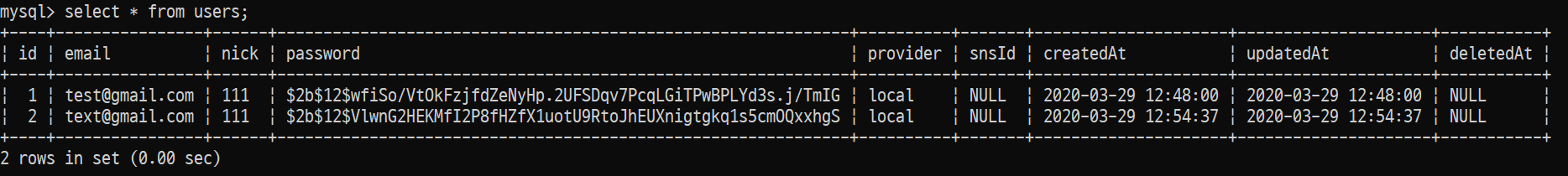 이제 회원가입을 하고 그 정보로 로그인하는 것이 가능해졌다. mysql도 확인해보면 가입한 정보들이 쌓인 것을 볼 수 있다.