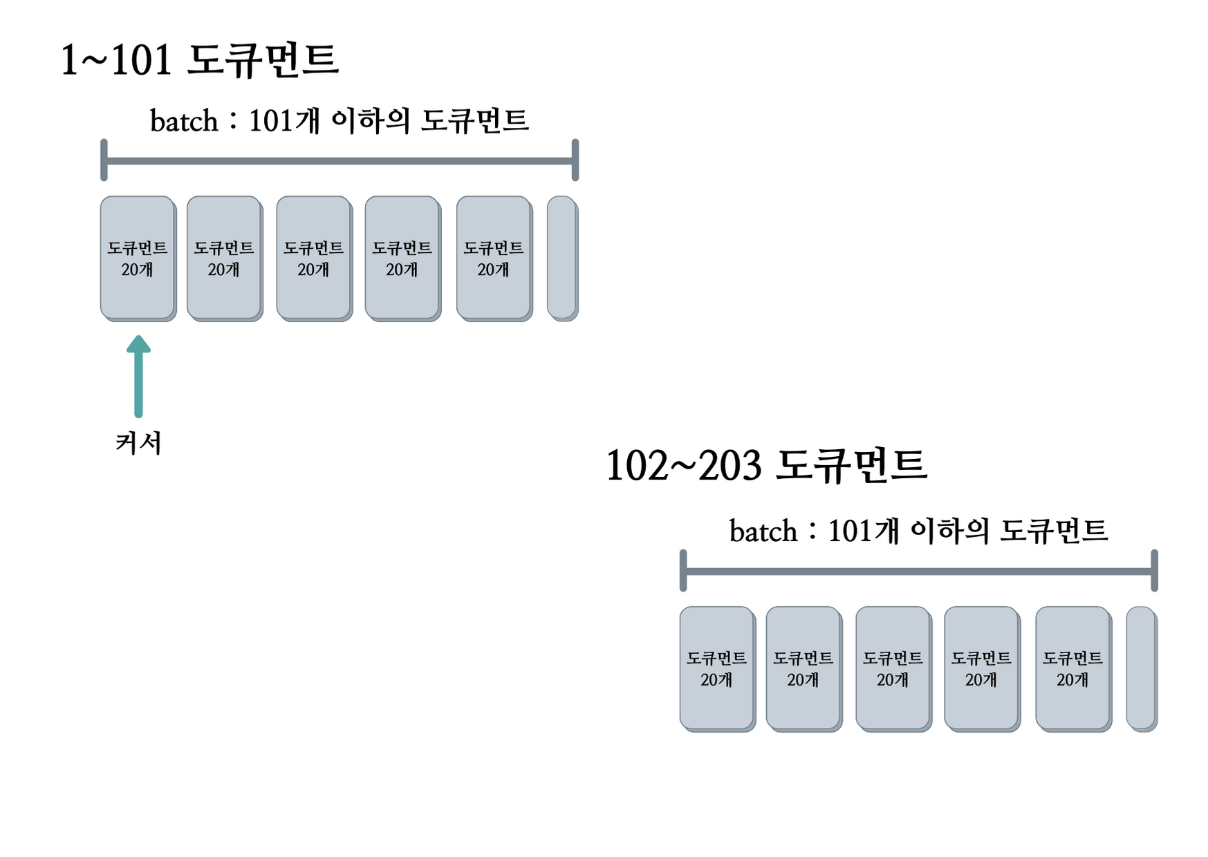 구체적으로 접근해보자. find 명령에 해당하는 도큐먼트가 1억개라고 가정해보자. 이 때 find 명령어를 사용하면 첫번째 batch는 101개의 도큐먼트를 가지고 있고, 커서는 이 중 20개를 가리킨다. 커서는 빠르게 20개씩 도큐먼트를 출력한다. 101개가 넘어가는 순간 두번째 batch로 커서가 이동하여 또 20개씩 가리킨다.