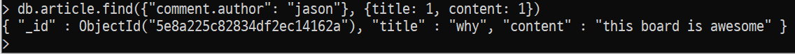 ex - db.article.find({"comment.author": "jason"}, {title: 1, content: 1})는 해당 쿼리를 만족하는 도큐먼트 중 title과 content 필드만을 출력하라고 하는 것입니다. 1외에도 true 값도 가능합니다. 단, _id는 기본값이 true라서 따로 프로젝션에 지정하지 않아도 출력됩니다. _id를 출력하지 않으려면 _id: 0을 명시적으로 줘야 합니다.