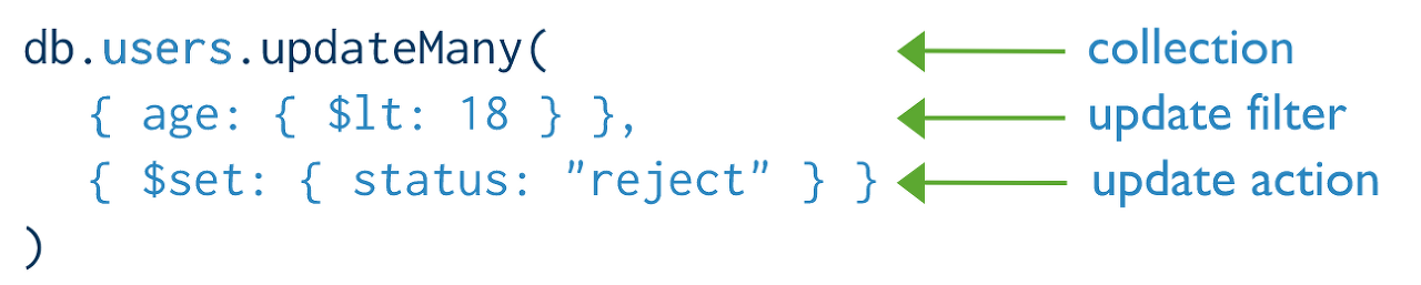 db.[컬렉션].updateMany({쿼리}, {수정할 내용}, {옵션}) // 쿼리에 해당하는 모든 도큐먼트를 수정합니다.