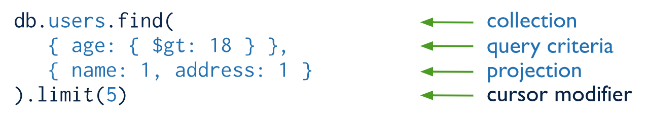 아래 예시는 age가 18보다 큰 도큐먼트 중 name과 address를 가져옵니다. 최대 5개 까지만 출력하도록 limit를 걸어놓았습니다.