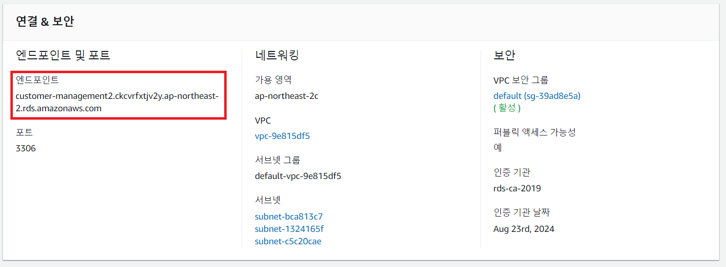 "host": "RDS 엔드 포인트[customer-management2.ckcvrfxtjv2y.ap-northeast-2.rds.amazonaws.com]",
