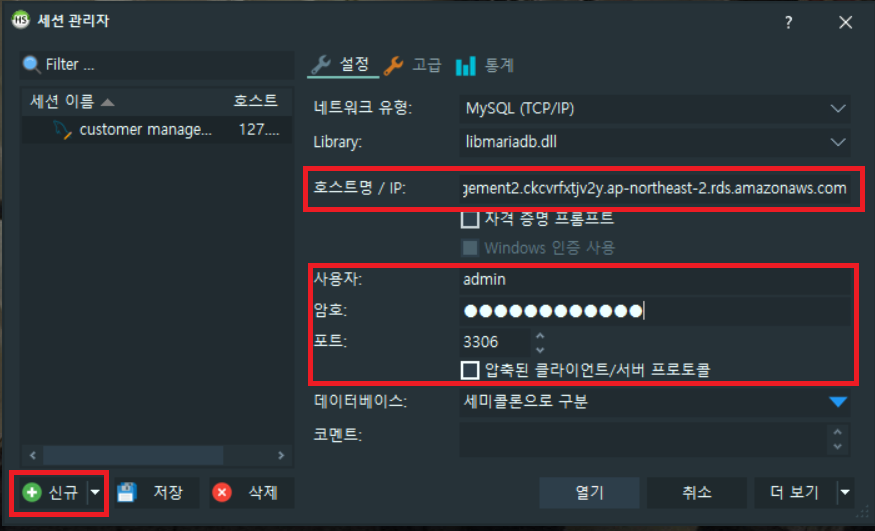 설치 이후에는 아래 신규 버튼을 눌러 세션을 생성한 후, RDS를 참고해 호스트명 / IP에는 엔드포인트, 사용자와 암호는 RDS 생성시에 입력했던 그대로 입력하고 포트도 RDS 설정대로 입력합니다.