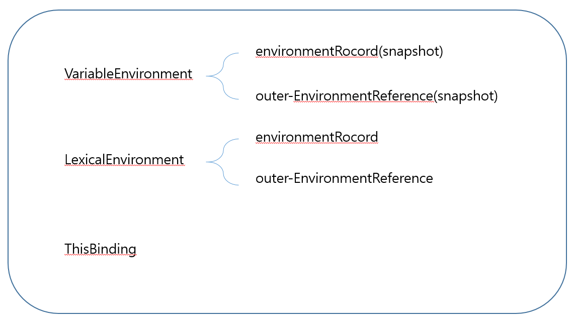 실행 컨텍스트 객체는 VariableEnvironment와 LexicalEnvironment로 구별되며 각각 environmentRecord와 outer-EnvironmentReference로 구성되어 있습니다. VariableEnvironment에 담기는 건 일종의 스냅샷이기에 자주 활용하는 건 LexicalEnvironment입니다.