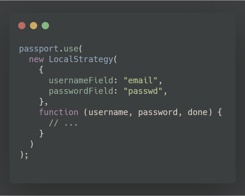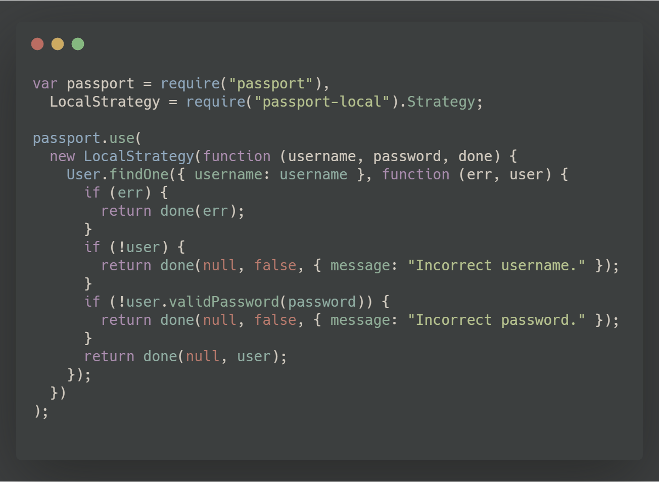 앞서 인증 요청을 보내기 전에 전략을 configure해야 한다고 했습니다. 전략과 그 구성은, use() 함수에 의해 설정됩니다. 예를 들면, 다음의 예시는 아이디와 비밀번호를 활용한 local 전략입니다.