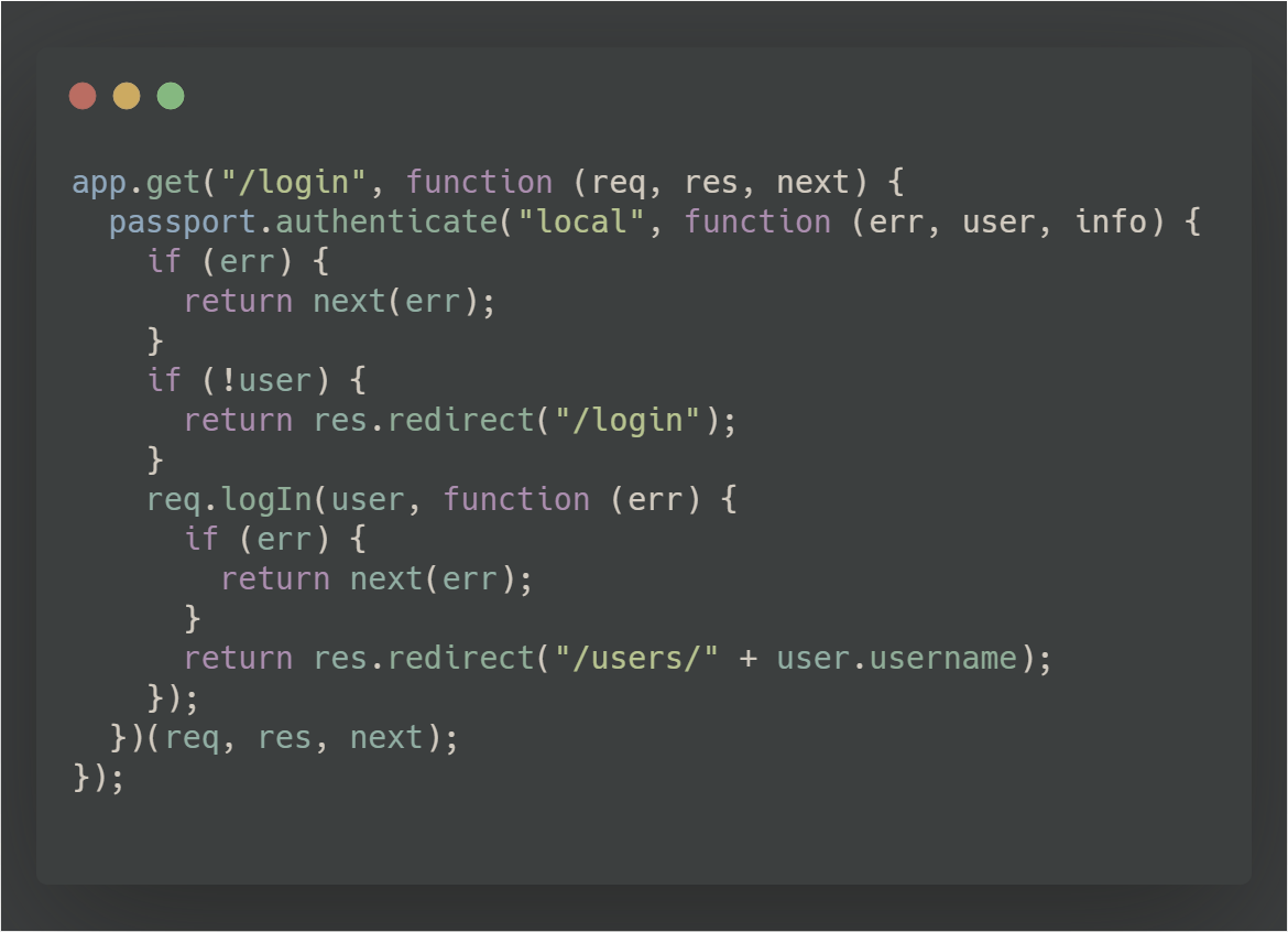 위 예시에서 authenticate()는 미들웨어로 사용되지 않고 route 핸들러로 사용되었습니다. 이 방식을 통해 클로저로 req, res 객체에 접근할 수 있습니다.