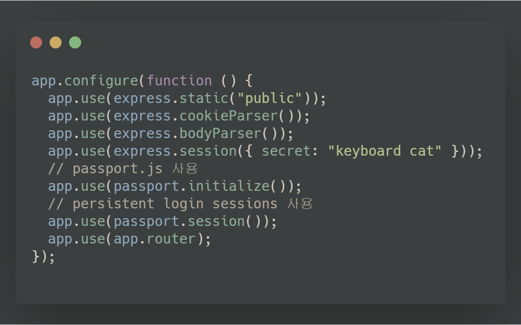 Express 기반 어플리케이션에서 passport를 사용하기 위해선 passport.initialize() 미들웨어가 필요합니다. 만약 영구 로그인 세션(persistent login sessions)을사용한다면 passport.session() 미들웨어 또한 반드시 사용되어야 합니다.