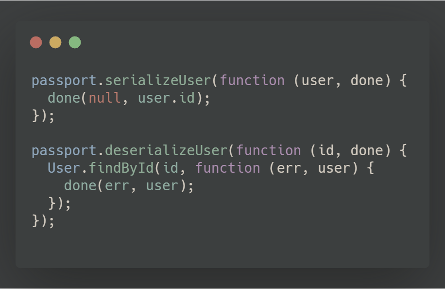 * serialize란 req.session 객체에 무엇을 저장할 것인지를 선택하는 것입니다. 세션에 모든 정보를 저장하는 것은 세션의 용량을 너무 크게 만드므로 대개 user의 id만을 저장합니다. deserialize는 serialize를 통해 받은 유저의 id를 이용해 이용자를 식별하는 것입니다.