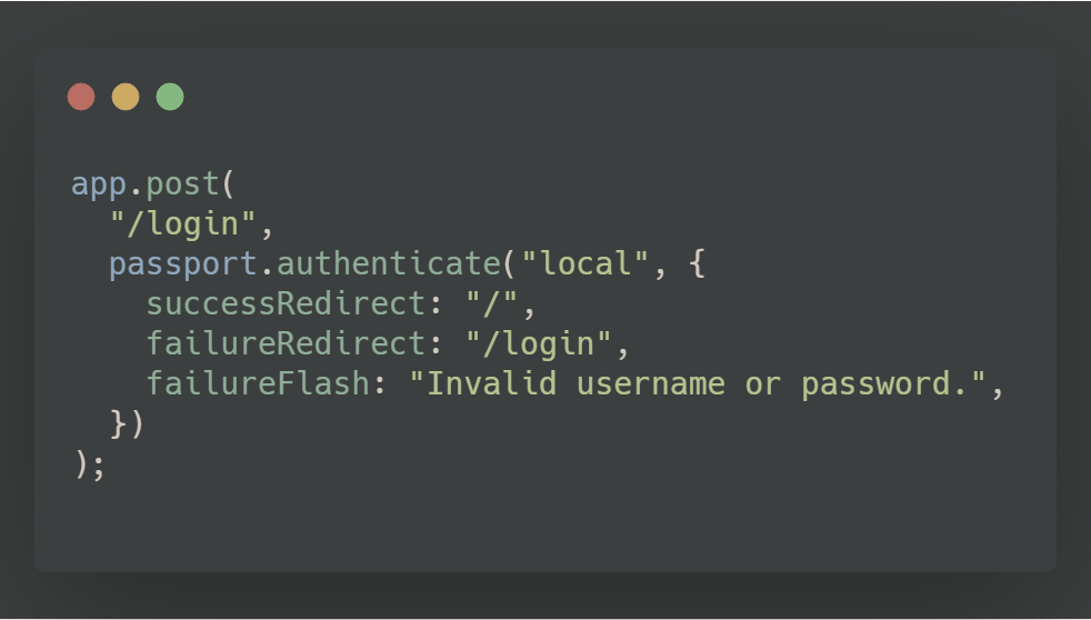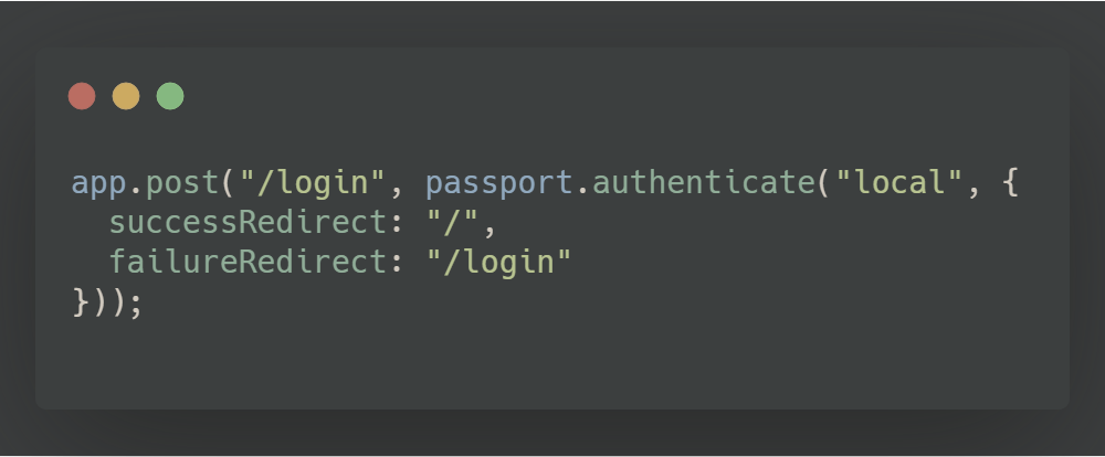 위의 경우 리다이렉션 옵션은 기본에 오버라이드됩니다. 인증에 성공하면 유저는 /(home page)로 리다이렉션되며 인증 실패시 다시 로그인하기 위해 /login으로 리다이렉션 됩니다.