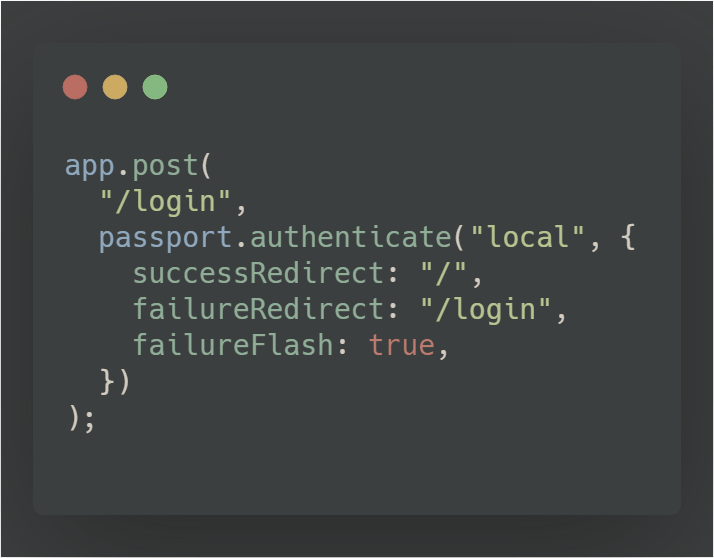 failureFlash를 true로 설정하면 passport의 전략을 체크하는 콜백 함수에서 제공하는 메세지가 있는 경우 오류 메세지를 flash하도록 지시합니다.