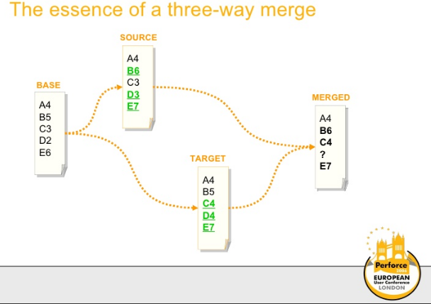 conflict가 발생하는 곳에서 병합하는 방법이다. 3 way merge는 기본적으로, base와 비교하여 변화한 곳은 변화시키고, 둘 다 변화한 곳은 confilct 상태로 두어 사용자가 결정하게끔 한다.