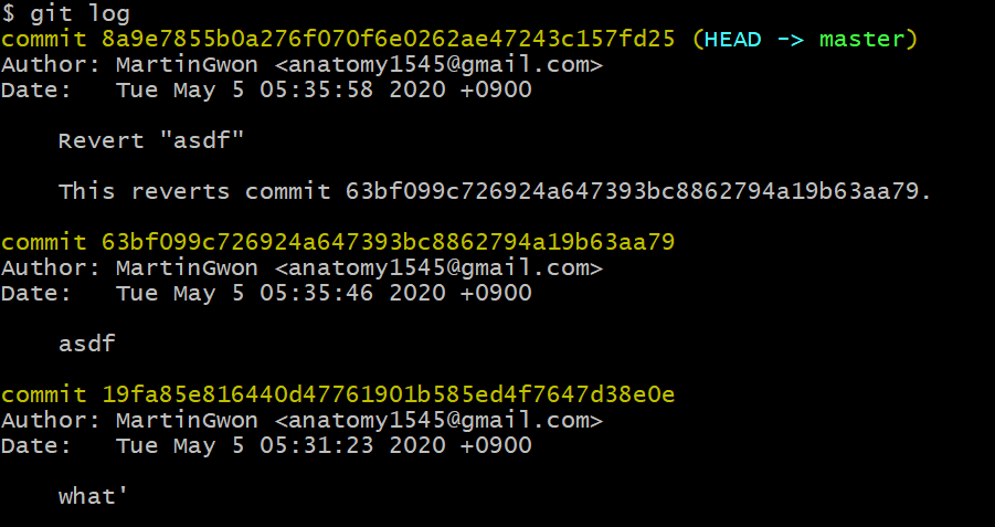 log를 찍어보니 revert한 결과물이 다음과 같이 나왔습니다. 내용물을 비교해보면 알겠지만, revert된 값은 그 전의 커밋된 것과 같습니다. 8a9e7855b0a... 버전은 19fa85e816...의 내용이 같습니다.