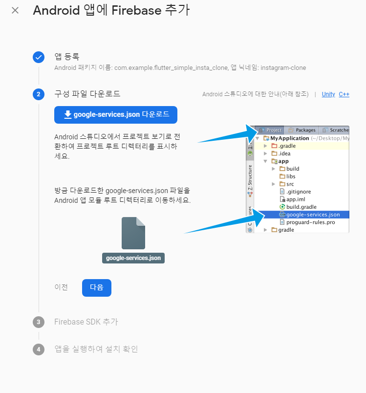 등록 후에는 json을 다운로드 받아 적용하고자 하는 프로젝트의 android>app에 넣어주도록 합시다. 중요한 정보가 들었으니 gitignore 처리를 해 줍시다.
