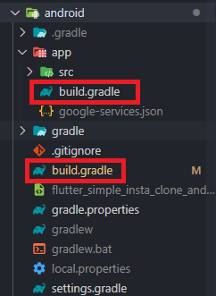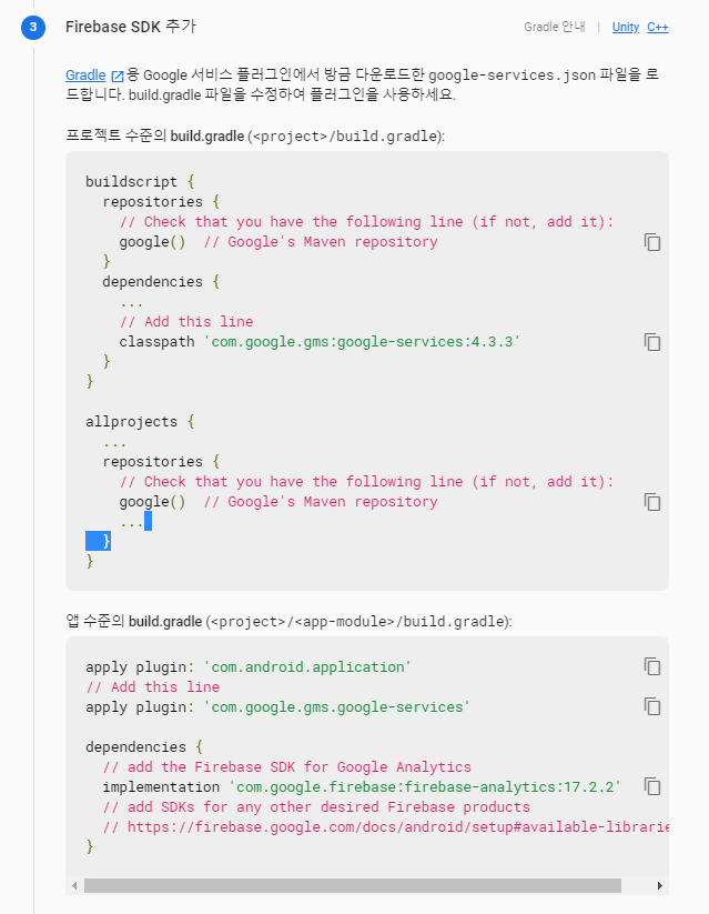 그 후에는 Firebase SDK를 추가합니다. 프로젝트 수준의 build.gradle은 android>build.gradle을 의미하고