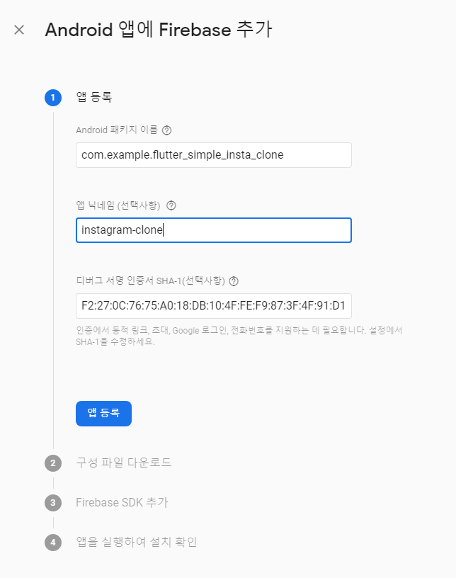 등록 과정에서 android>app>src>main>AndroidManifest.xml에 있는 패키지의 이름을 Android 패키지 이름으로 적어주면 됩니다. 도움말을 보면 앱수준의 build.gradle 파일의 applicationId라고 하는데 여기에도 같은 이름이 있습니다.