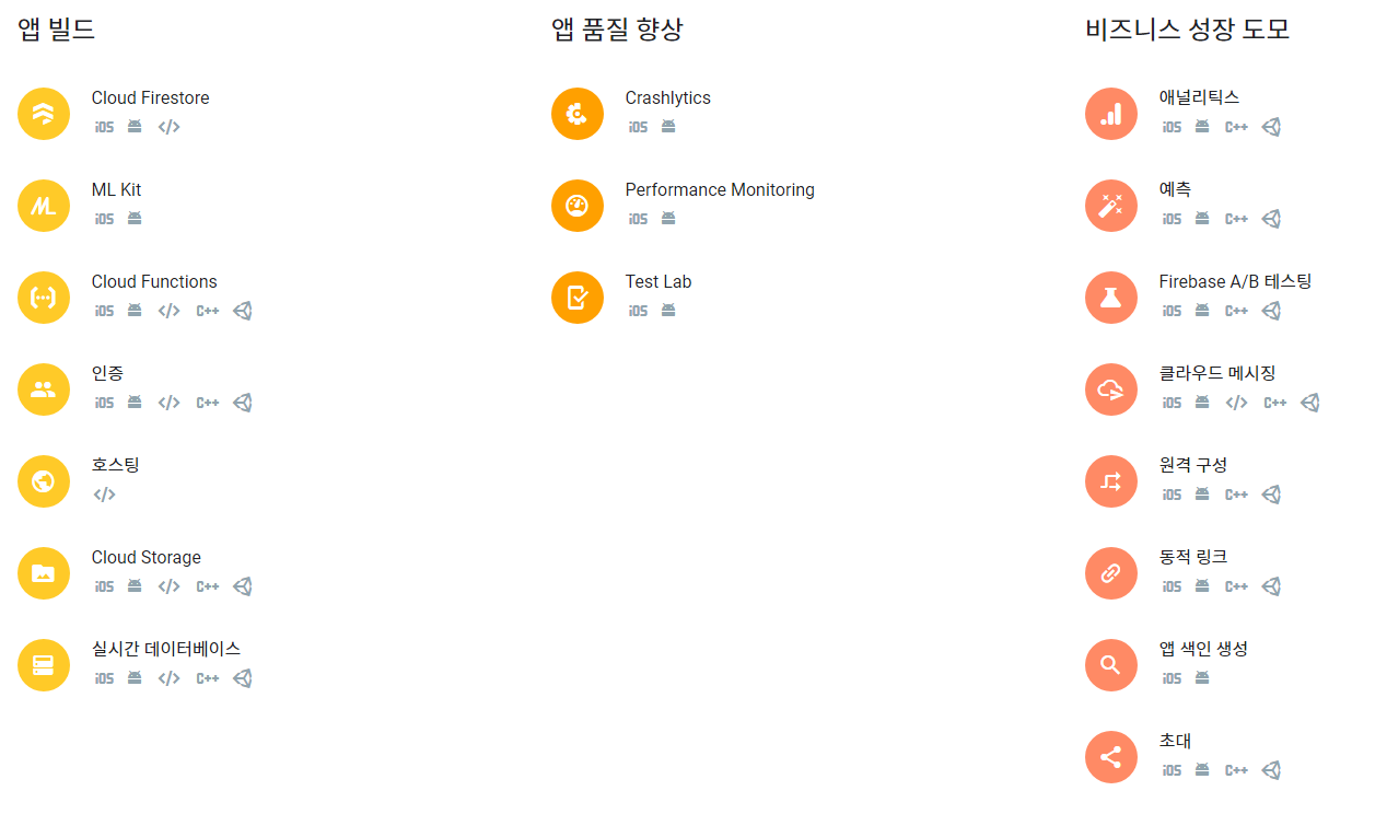 문서에서 Firebase에서 사용할 수 있는 모든 서비스를 확인할 수 있습니다.