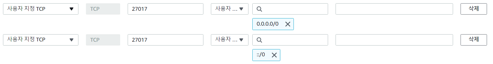 몽고db는 기본적으로 27017 포트를 사용하니 22번 ssh 포트 외에 27017포트를 anywhere로 열어두자.