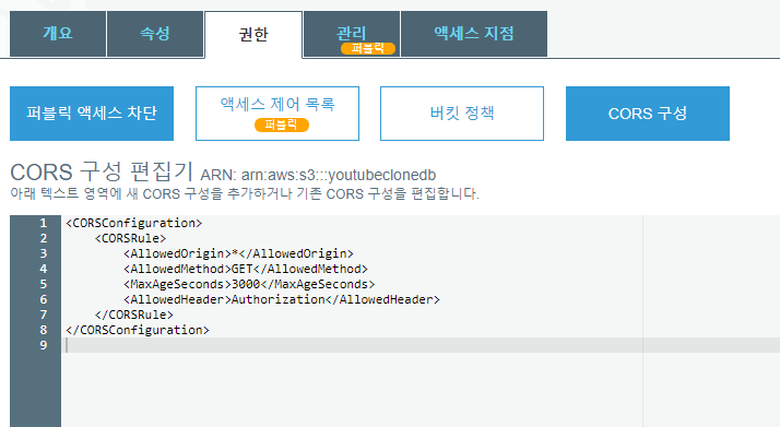 다음 페이지에 들어가서 CORS 구성을 손 보면 된다.