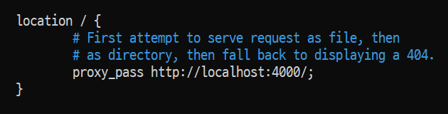 site-available에서 사용 중인 default에서 location 수정함으로써 80번 포트로 접근하면 4000번 포트로 이동시키는 proxy를 구현해보겠습니다. virtual host를 사용중이라면 해당 호스트의 설정을 정의한 파일을 수정하시면 됩니다.