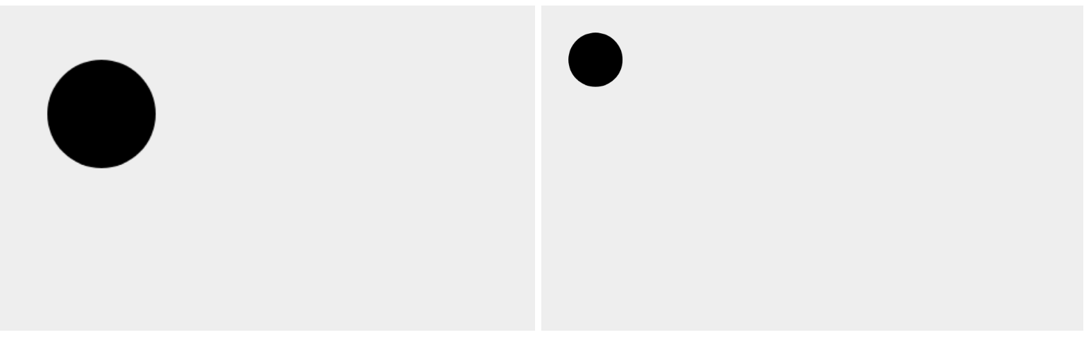 위 코드를 보시면 css로 같은 넓이, 높이를 주었기 때문에 크기는 똑같습니다만, 좌측 캔버스의 직접도가 더 높기 때문에 같은 크기의 원을 그려도 원이 작게 보입니다.