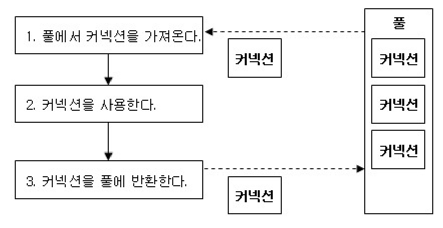 이러한 커넥션을 동시에 처리하기 위해서는 Pool을 구성해야 한다. Pool의 제한 인원에 해당 되는 것은 동일한 Connection으로 관리하고, 처리가 끝나면 Connection에 들어오지 못한 대기 인원을 Pool에 포함시켜서 처리한다.