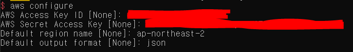 aws configure를 입력하여 이용하고자 하는 User의 Access, Secret Access Key를 입력해주자. ACloudGuru에서 Access, Secret Access Key는 programatic login에 쓰인다고 했는데 바로 이 때가 그걸 사용하기에 적절한 때이다.