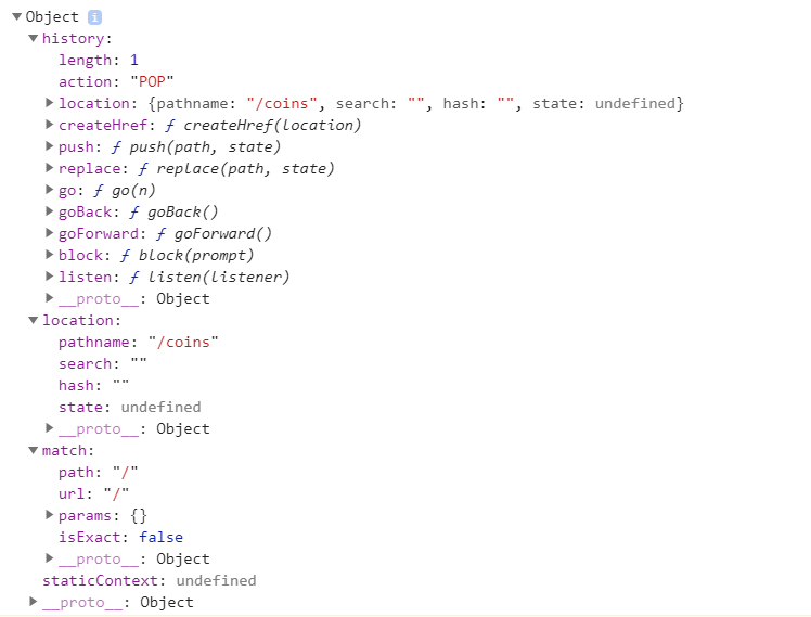 Route를 통해 경로로 접근할 수 있는 컴포넌트에서 withRouter로 감싸주면 이용할 수 있는 props를 추출해보았다. 크게 history, location, match로 이루어져 있다. 뒤로가기나 앞으로가기 함수도 들어있으므로 유용하게 처리할 수 있다. 이 객체는 Route가 지정한 component들에는 자동으로 들어있다. 예를 들어 <Route path="/tv" component={TV}>의 경우 TV component 다음 props를 자동으로 가진다.